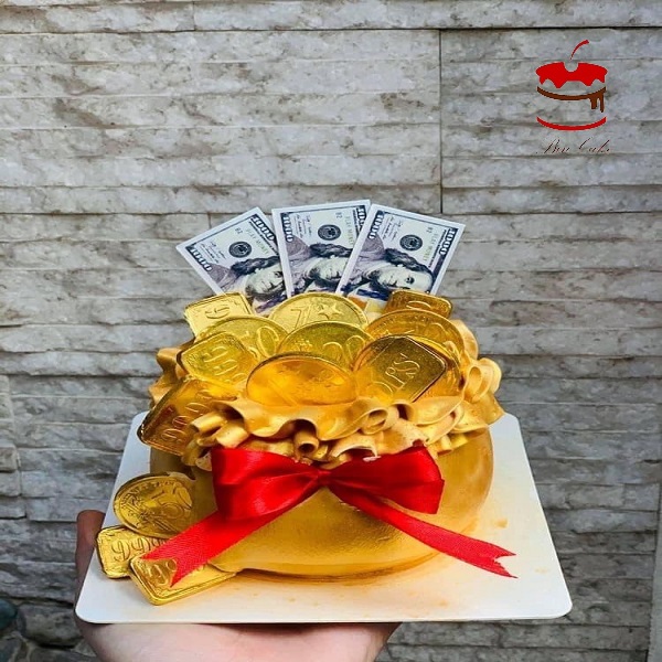 - Mẫu bánh kem hủ vàng được trang trí bởi nhiều đồng tiền vàng và tiền dollar như một lời chúc mong ngóng sự giàu có. Ngoài ra nền bánh màu vàng như một lời chúc cho sự may mắn, thịnh vượng. Bởi mang trong mình một ý nghĩa như vậy nên nó thường được nhiều vị khách săn đón mỗi khi đi dự lễ khai trường nào đó!!! Bạn nếu như vẫn còn đang tìm kiếm một mẫu bánh khai trương thích hợp thì có thể ghé xem thử mẫu bánh hủ vàng này bên tiệm thử nhé!!!