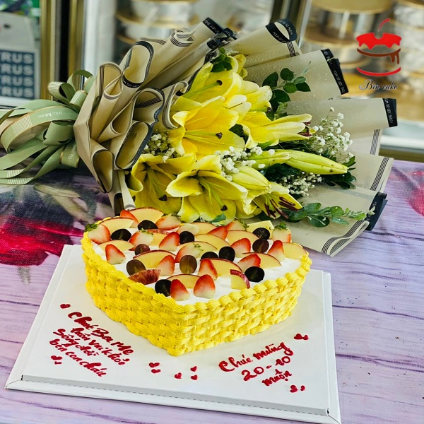 Một mẫu bánh kem tặng mẹ được làm bằng khuôn bánh hình trái tim kèm theo decor full lớp trái cây trên mặt bánh khiến mẫu bánh kem được trở nên ngon miệng và bắt mắt hơn. Mẫu bánh kem này được tặng kèm cùng một bó hoa ly tươi thơm ngào ngọt mà xinh đẹp thì còn gì đặc biệt hơn bạn nhỉ?? Nhanh tay đặt ngay mẫu bánh kem xinh này dành tặng đến mẹ yêu trong ngày đặc biệt đi bạn nhé! Tiệm tin chắc rằng không có lời nói ngọt ngào hoa mỹ nào có thể thắng được tình cảm bạn đặt trong sự chuẩn bị kỹ càng những món quà mà bạn dành tặng cho người thân