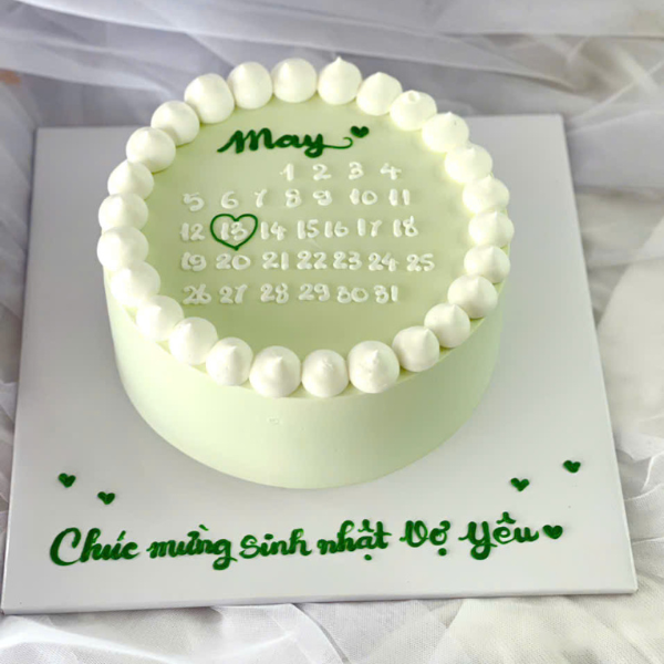 Chiếc bánh kem hình lịch tháng 5 với điểm nhấn là ngày 13 được khoanh trái tim, cùng dòng chữ "May" viết tay mềm mại, tạo nên một món quà sinh nhật lãng mạn và ý nghĩa. Bánh được trang trí viền kem trắng tinh tế và dòng chữ "Chúc mừng Sinh nhật Vợ Yêu" màu xanh lá cây đậm ở chân bánh, thể hiện tình cảm ngọt ngào.